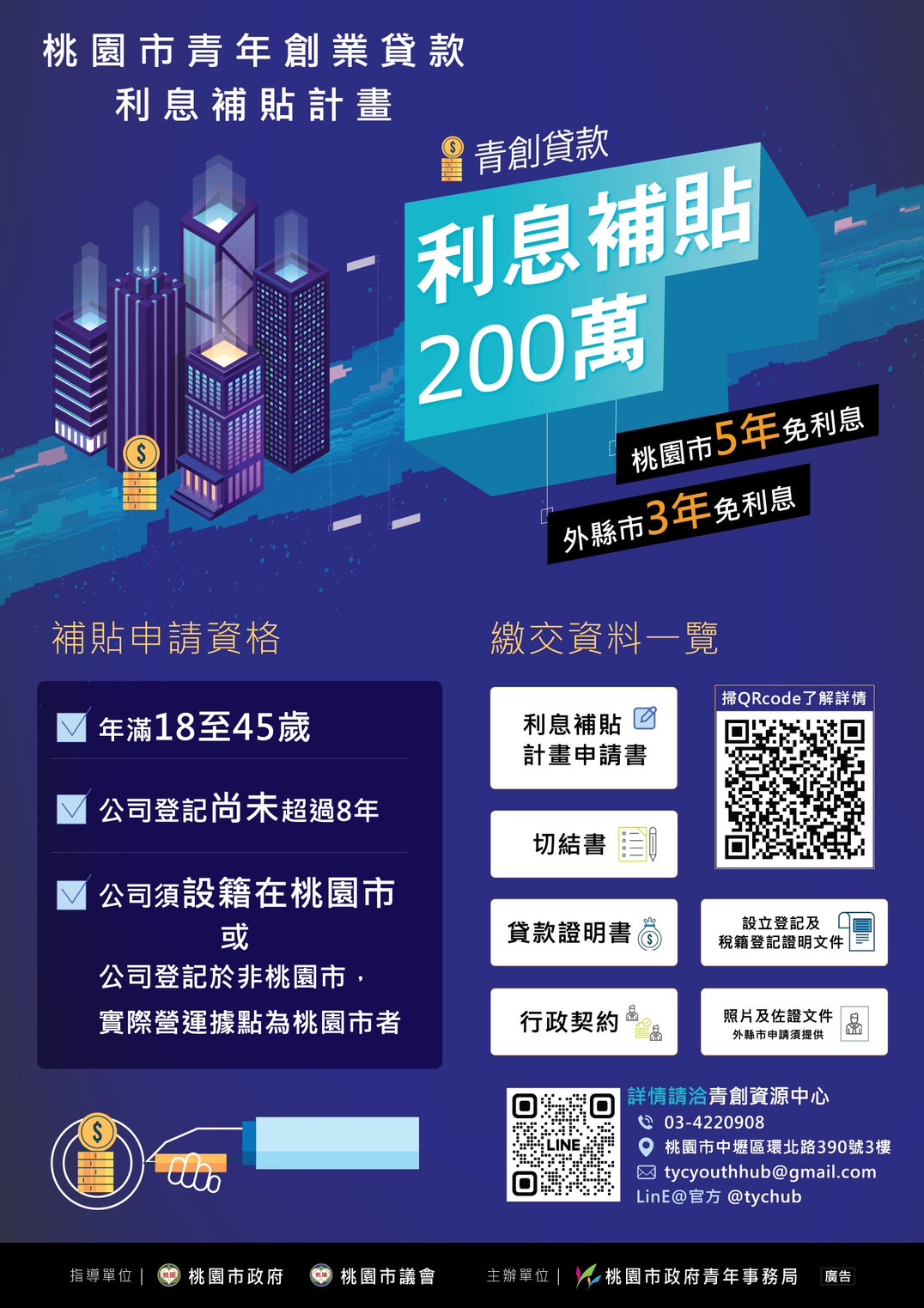 如您已完成青創貸款的桃園青創公司,即可申請200萬5年免利息補貼。
